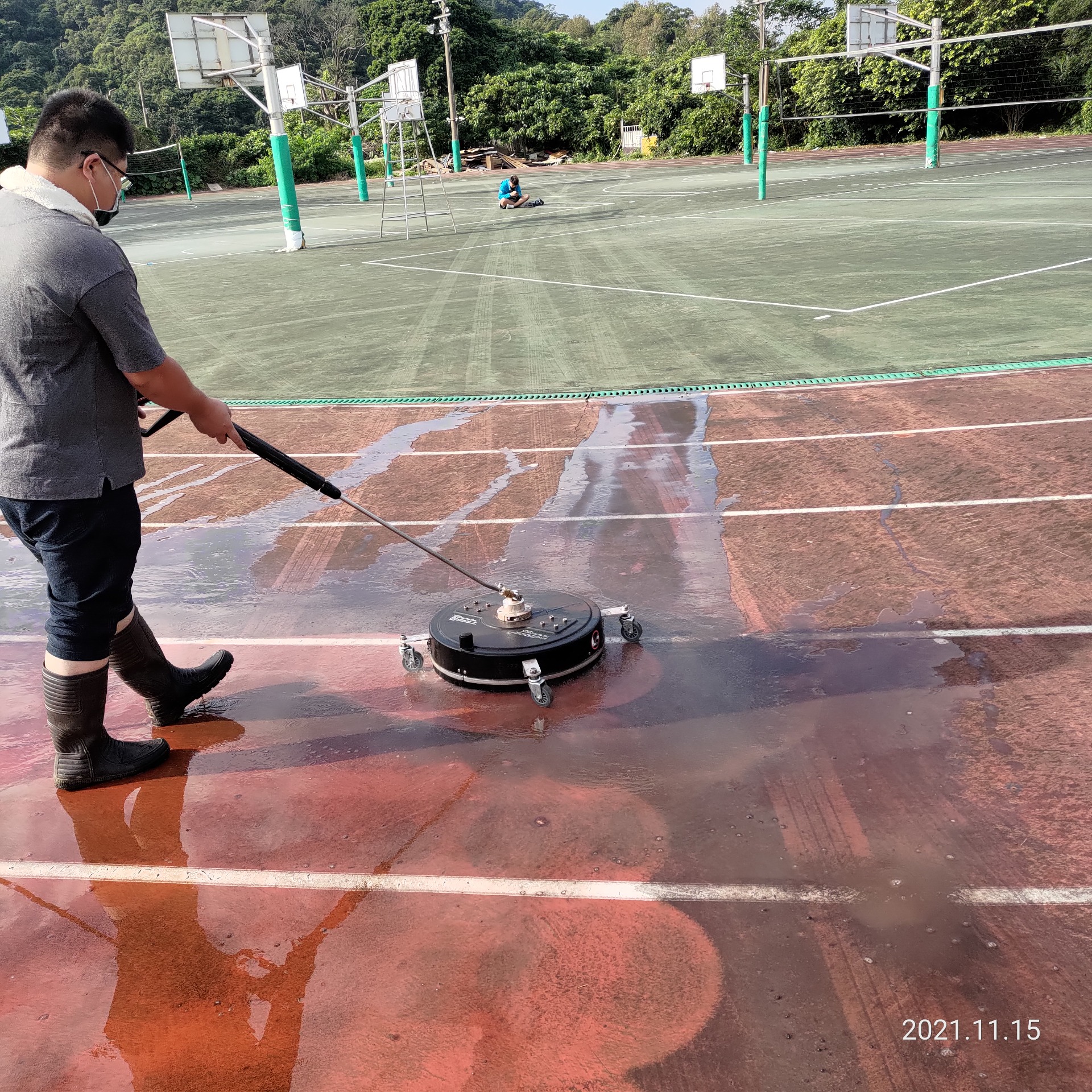 操場跑道必須定期使用高壓清洗,避免生長青苔,導致下雨天時地面濕滑人員滑倒
