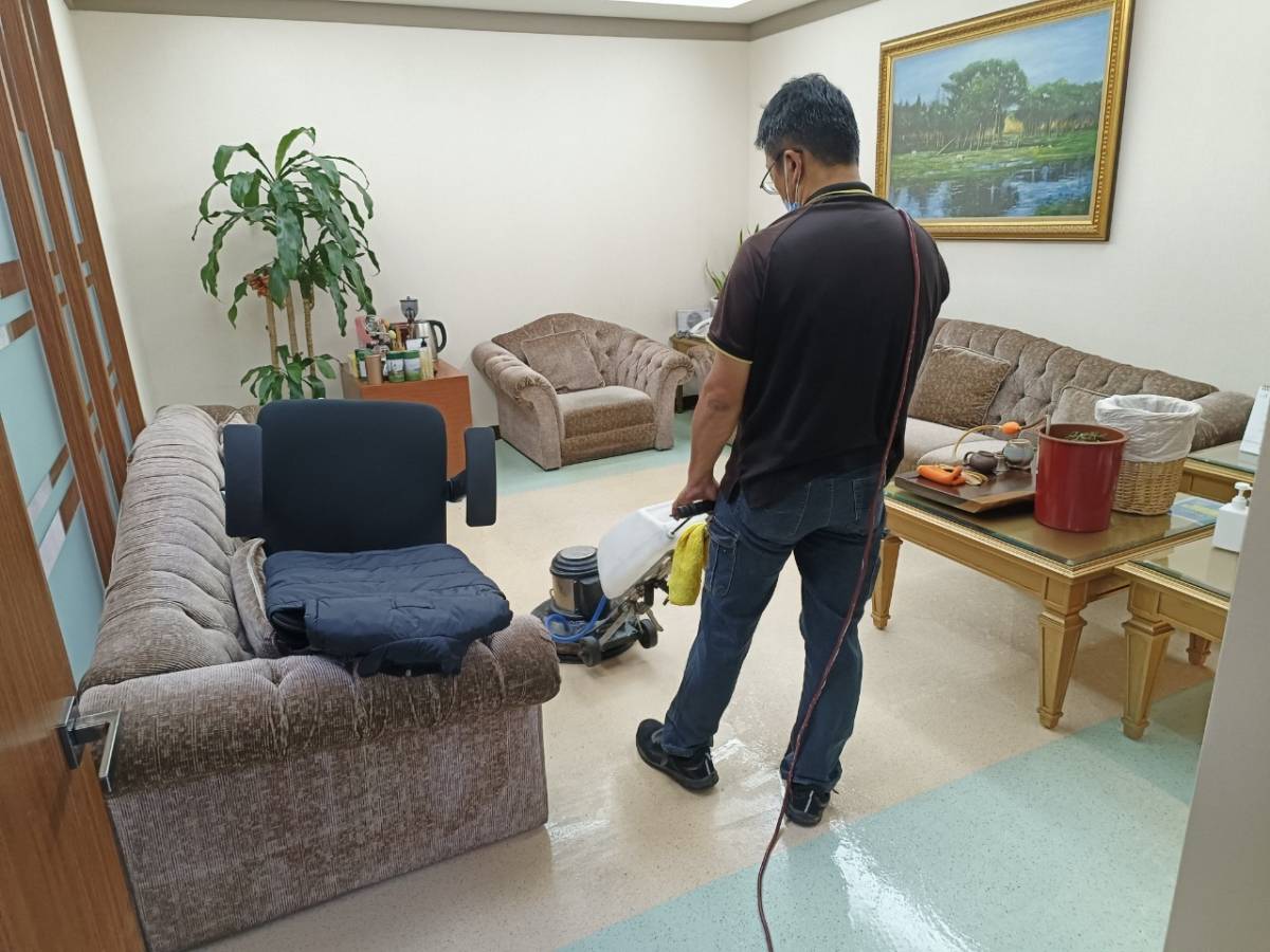 辦公室地板清洗時,需移動桌面下的櫃子清洗地板,避免造成髒污推積在底下,看似簡單的動作卻是許多清潔公司清洗地板時會省去的動作